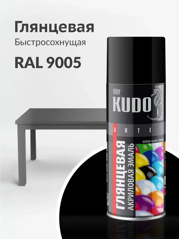 Аэрозольная краска KUDO "Эмаль универсальная быстросохнущая RAL в баллончике" Акриловая, Глянцевая, 0.52 л, Чёрная RAL 9005