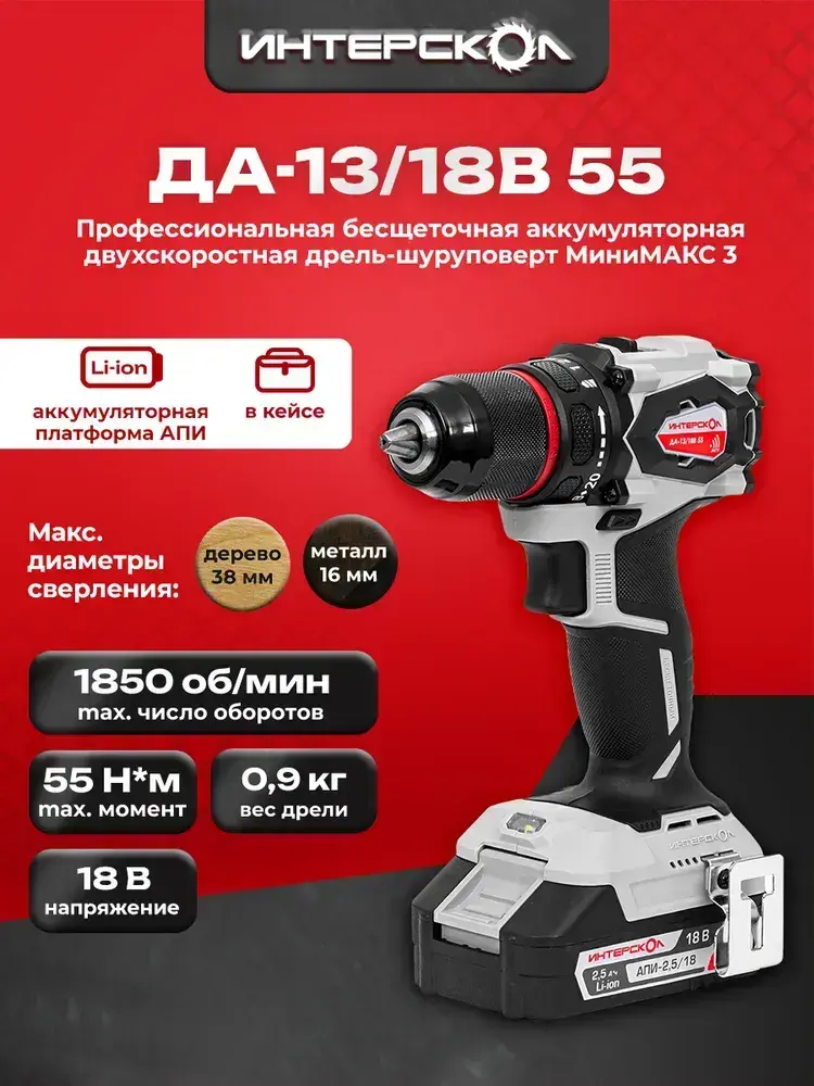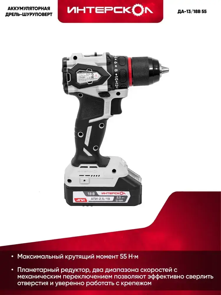 БЕСЩЕТОЧНАЯ аккумуляторная двухскоростная дрель-шуруповерт ИНТЕРСКОЛ ДА-13/18В 55 МиниМАКС без АКБ и ЗУ (952.0.0.70)