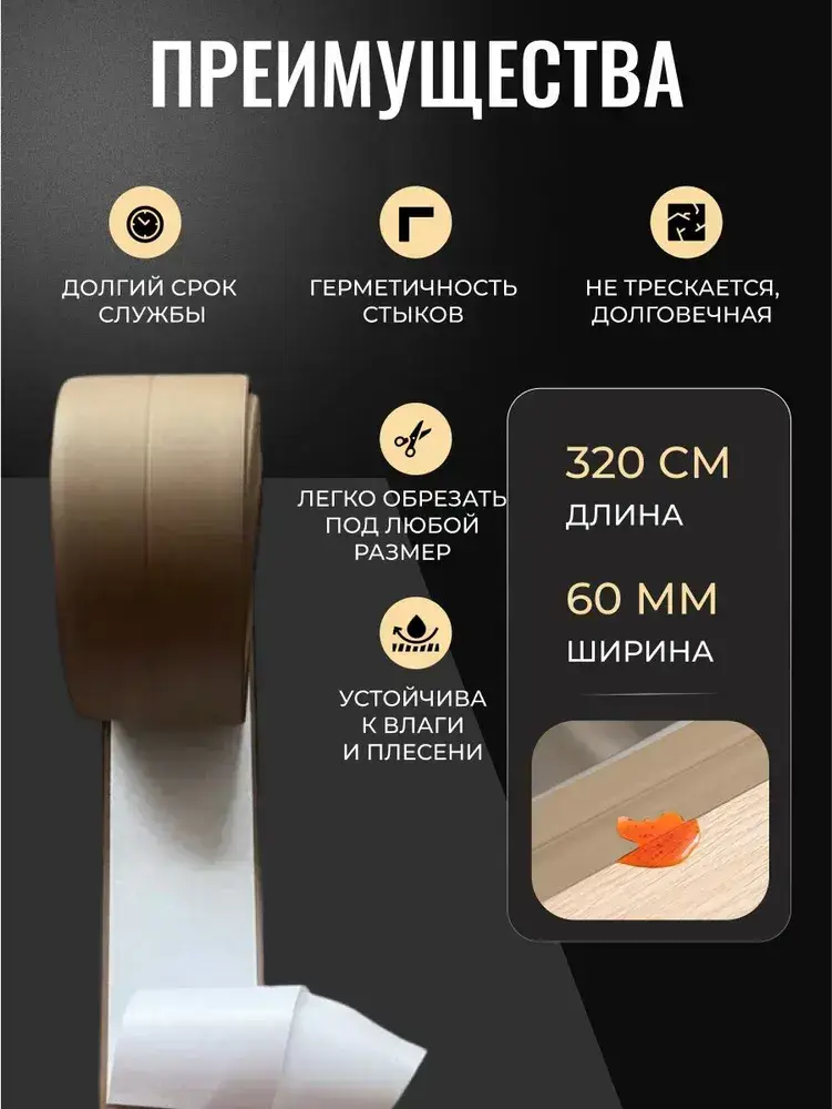 Бордюрная лента для ванны и кухни 60мм 3,2м. Самоклеящаяся декоративная клейкая лента коричневая, декоративный скотч