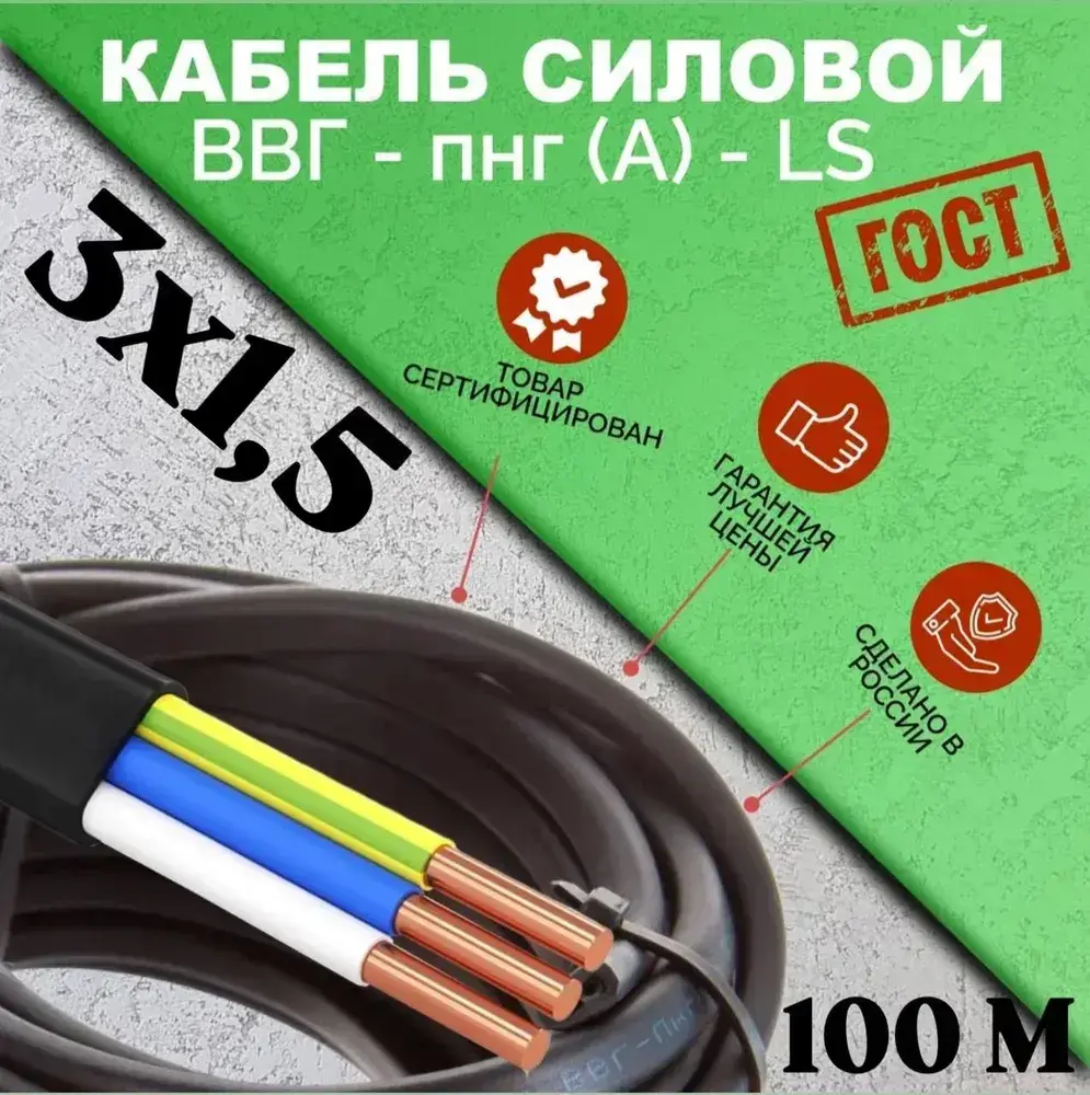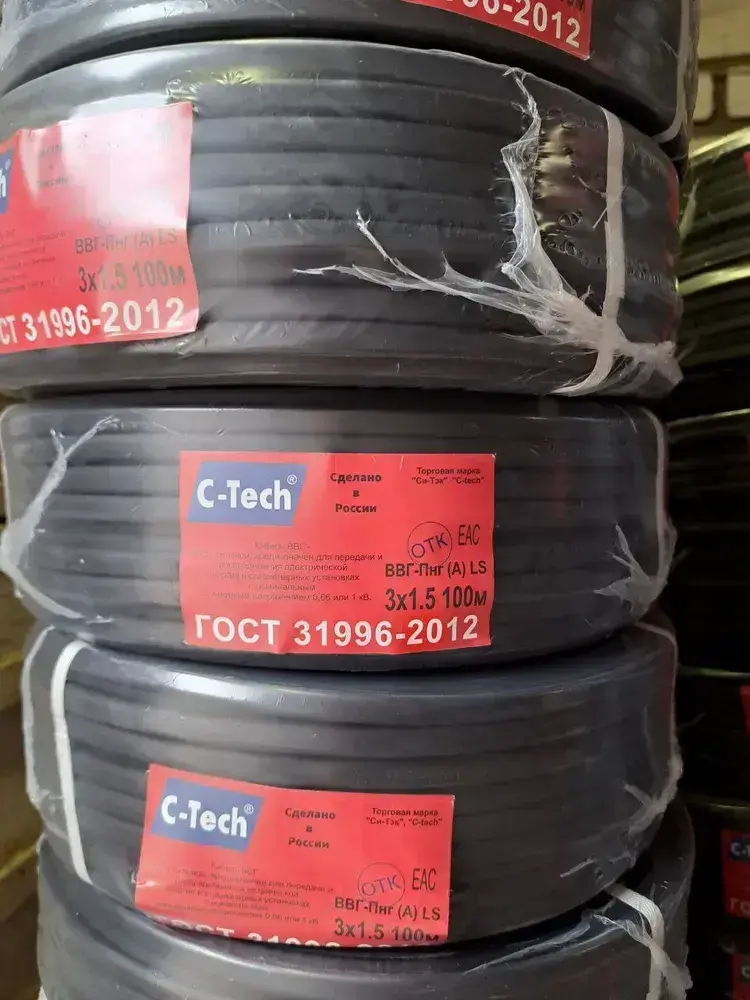 C-TECH Силовой кабель ВВГ-Пнг(A) 3 x 1.5 мм², 100 м, 8000 г