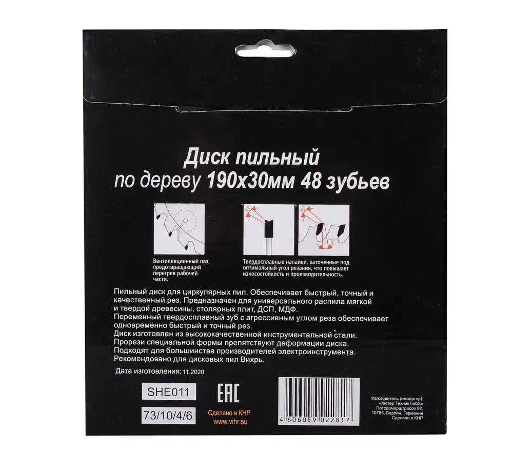 Диск пильный по дереву 190х30 мм, 48 зубьев+кольца 16/30, 20/30 Вихрь; для циркулярки, дисковой пилы