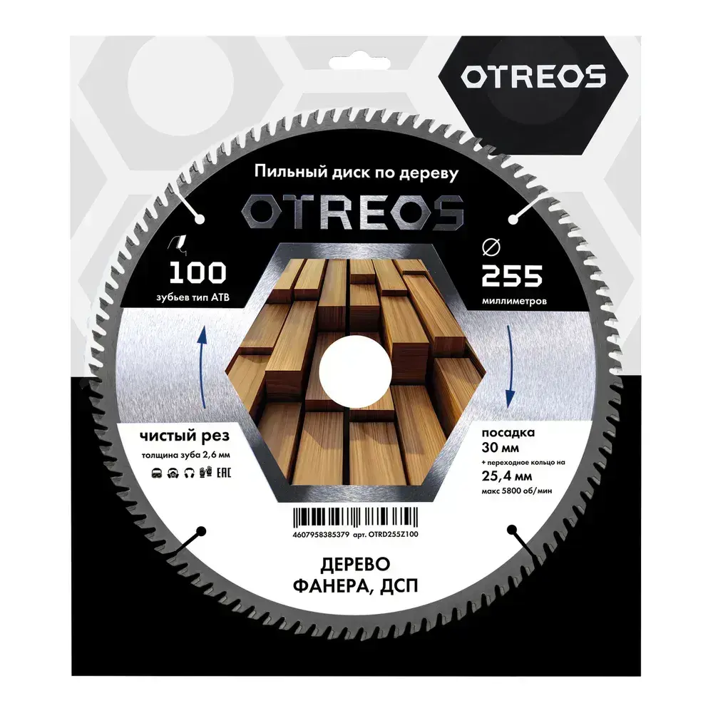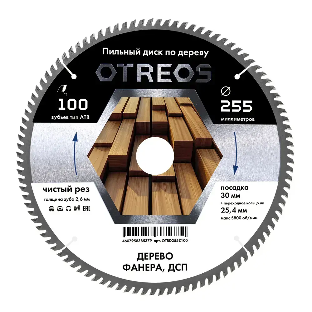 Диск пильный по дереву 255х30 мм 100 зубов АТВ, чистый рез, кольцо 25,4 OTREOS