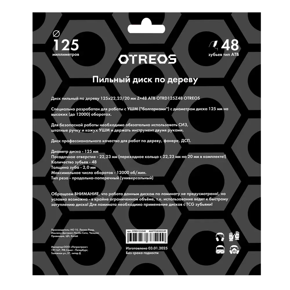 Диск по дереву для ушм 125 мм пильный, 48 зубов ATB, посадка 22,23, чистый рез OTREOS