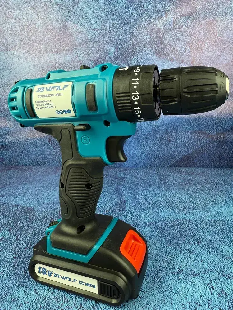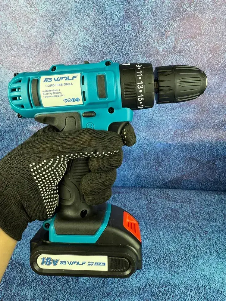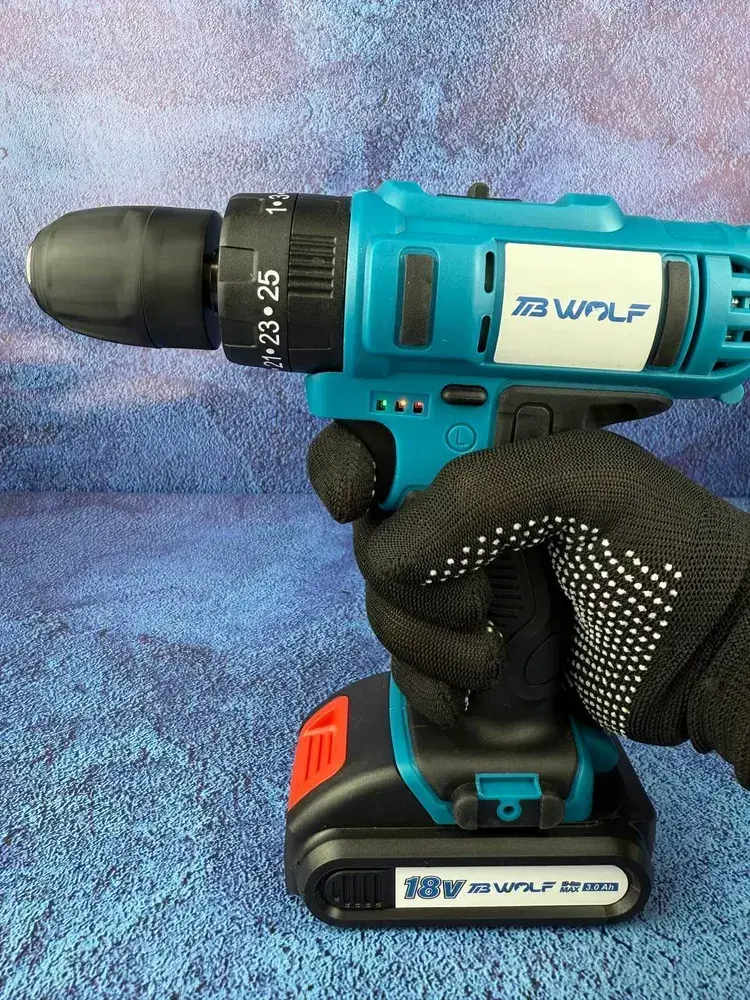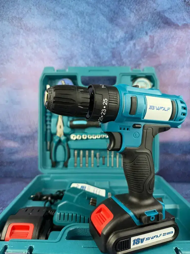 Дрель шуруповерт аккумуляторный TibWolf 18V 2 АКБ с набором инструментов 24 насадки и перчатки в наборе