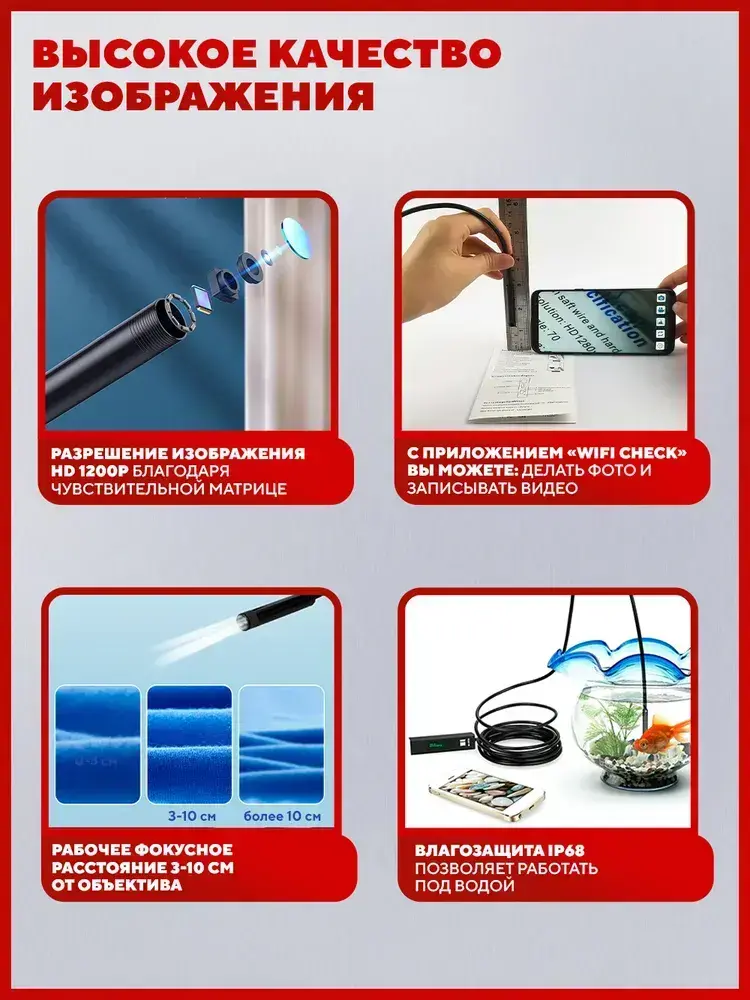 Эндоскоп автомобильный для смартфона, WiFi, 8 мм, 10 м, IP68, фото/видео, насадки в комплекте