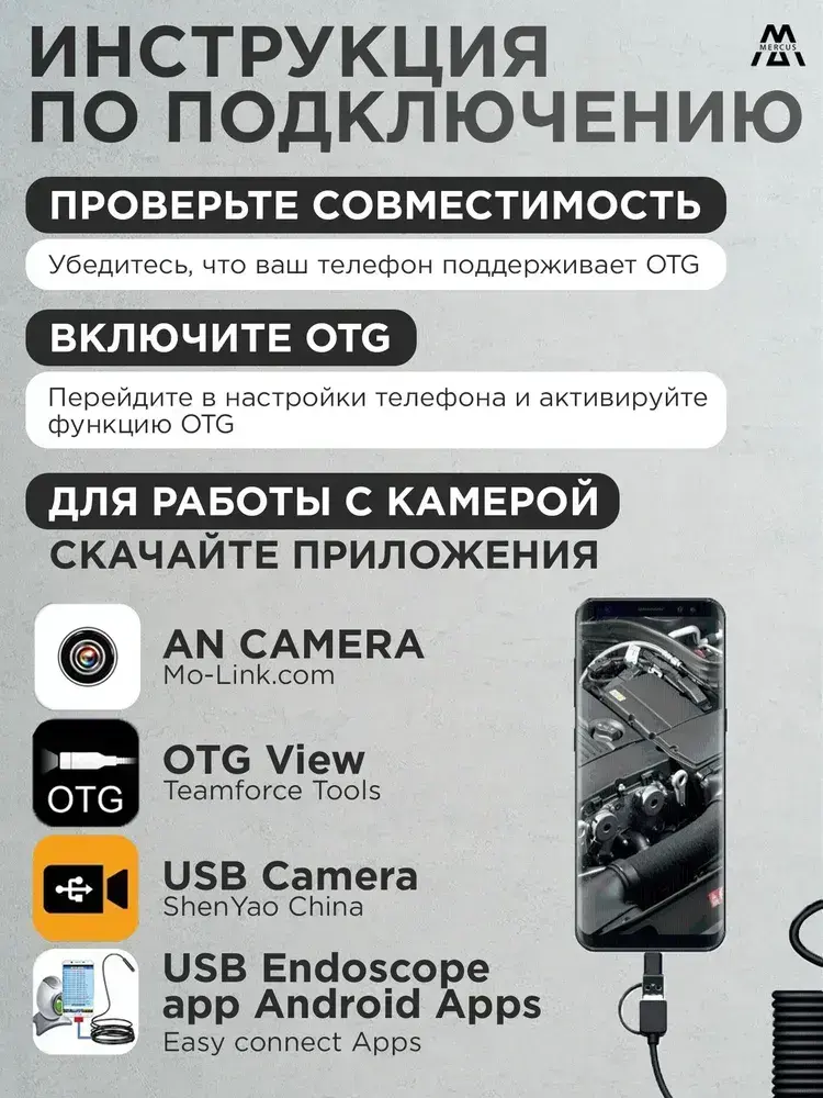 Эндоскоп автомобильный промышленный для смартфона Android с регулируемой подсветкой, полужесткий кабель, видеоэндоскоп MERCUS