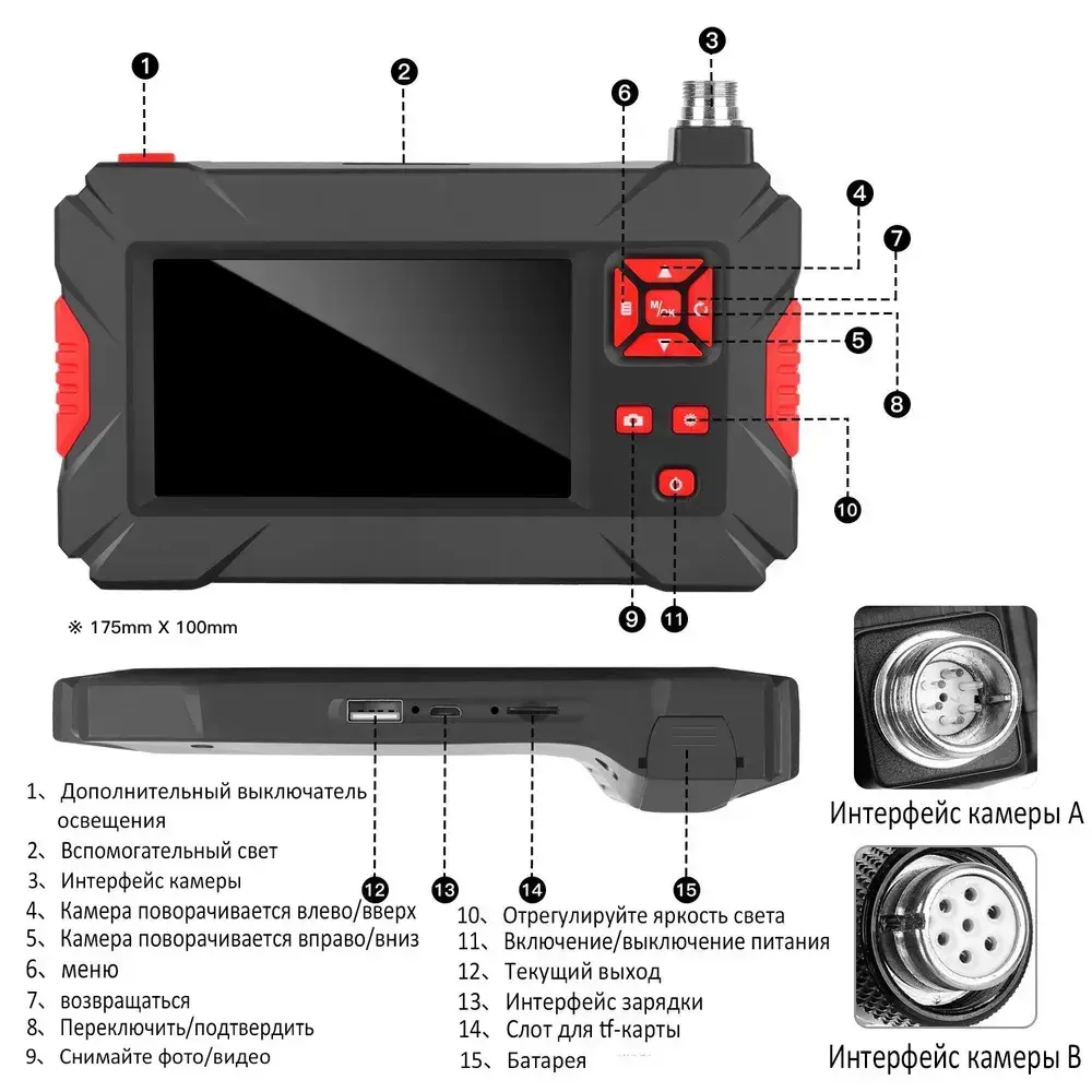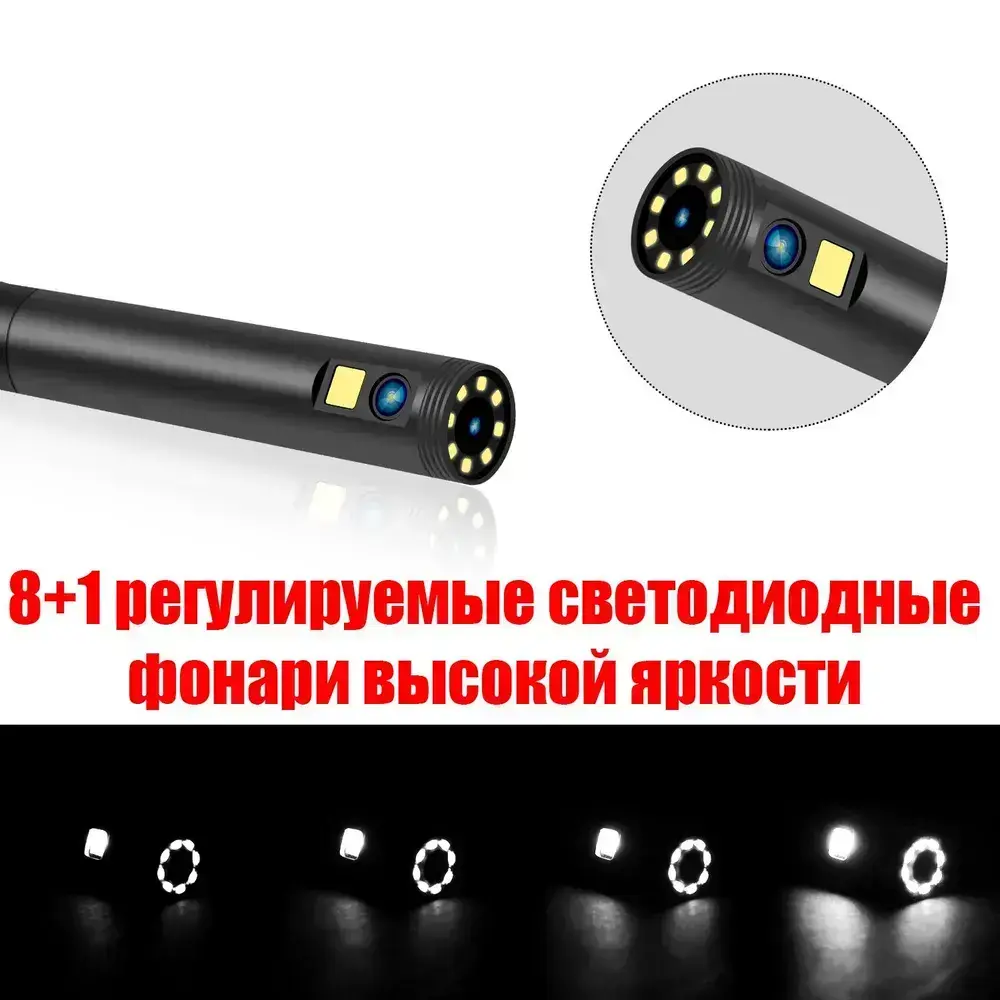 Эндоскоп автомобильный с экраном, 2 камеры (фронтальная и боковая), кабель 5 м, 8 мм, IP68, запись фото и видео на карту памяти (в комплекте), с подсветкой