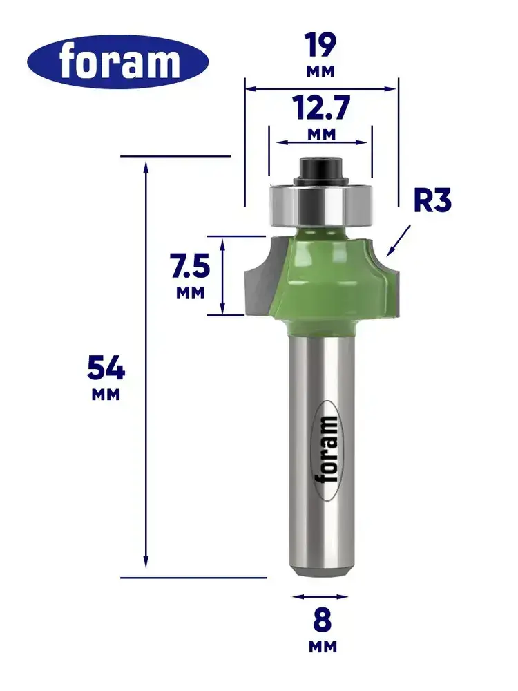 Фреза кромочная калевочная, FORAM, R3, хвостовик 8мм, подшипник 12,7мм