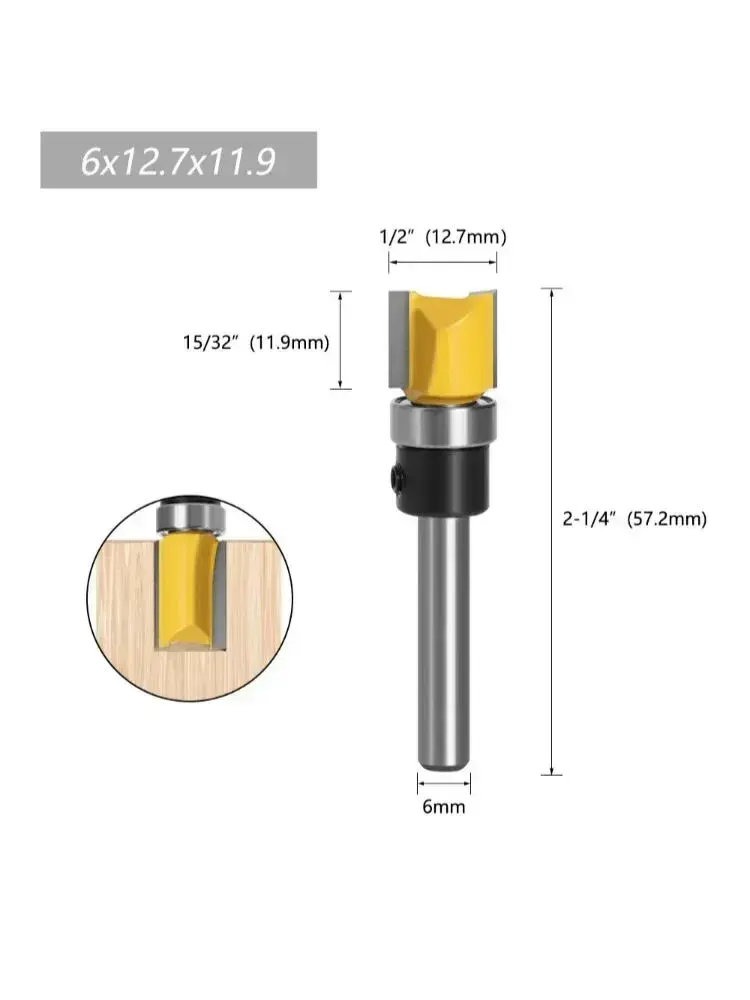 Фреза по дереву кромочная прямая для выборки заподлицо с верхним подшипником ,хвостовик 6 мм,3шт