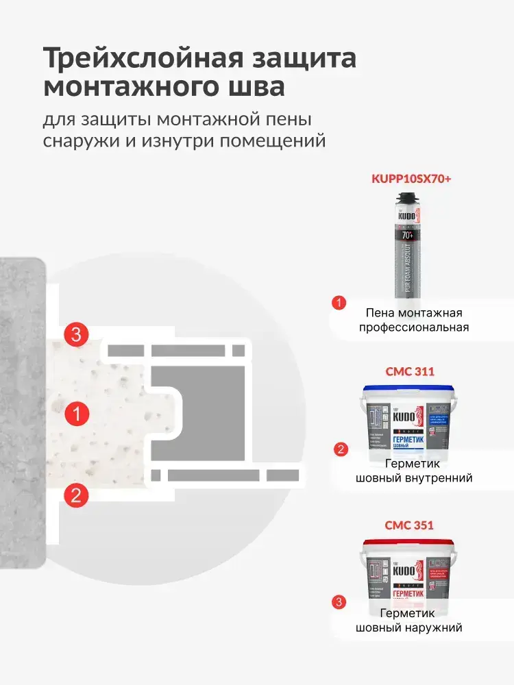 Герметик акриловый KUDO PROFF, наружный, паропроницаемый шовный, для монтажной пены при монтаже окон, SMP-351, 600 мл, белый