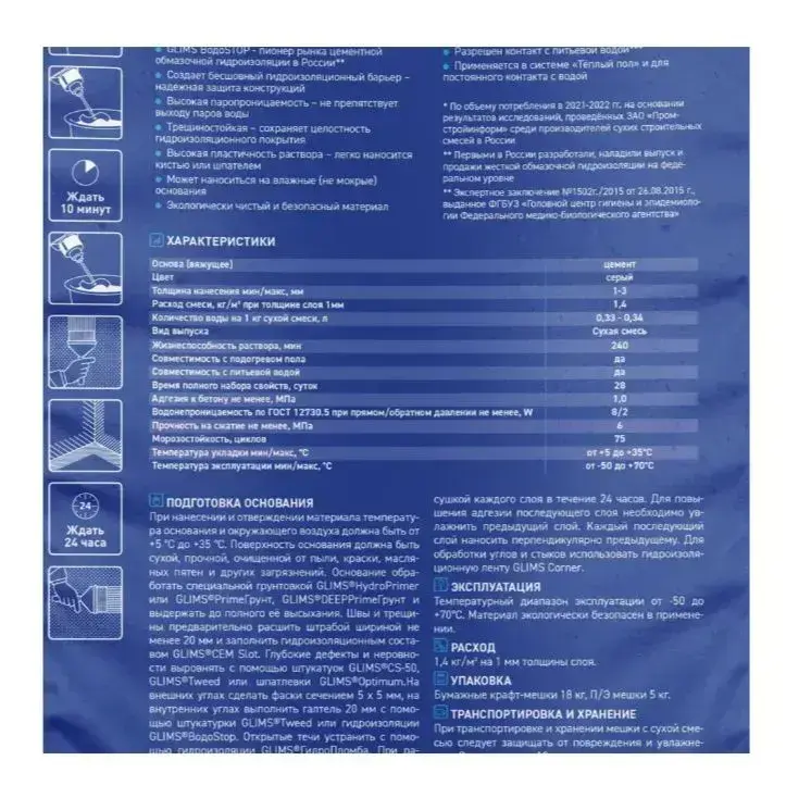 Гидроизоляция цементная Glims Водоstop глимс для подвала, бассейна, фундамента, стен и пола 18 кг