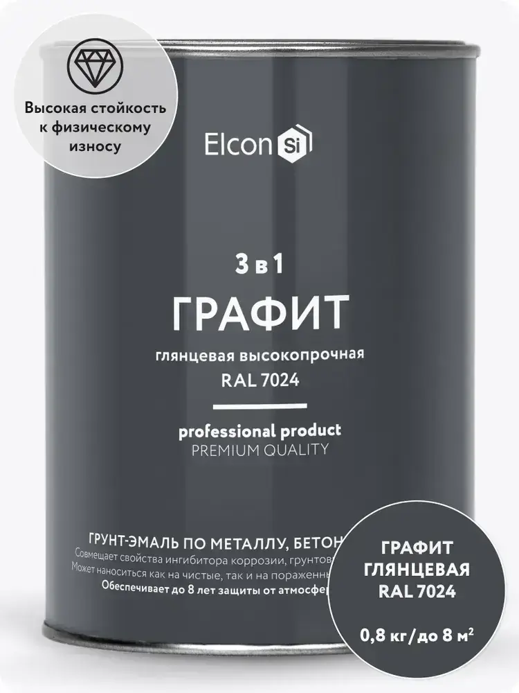 Грунт эмаль по ржавчине 3 в 1 Elcon краска по ржавчине для металла глянцевая, графит RAL 7024, 0,8 кг