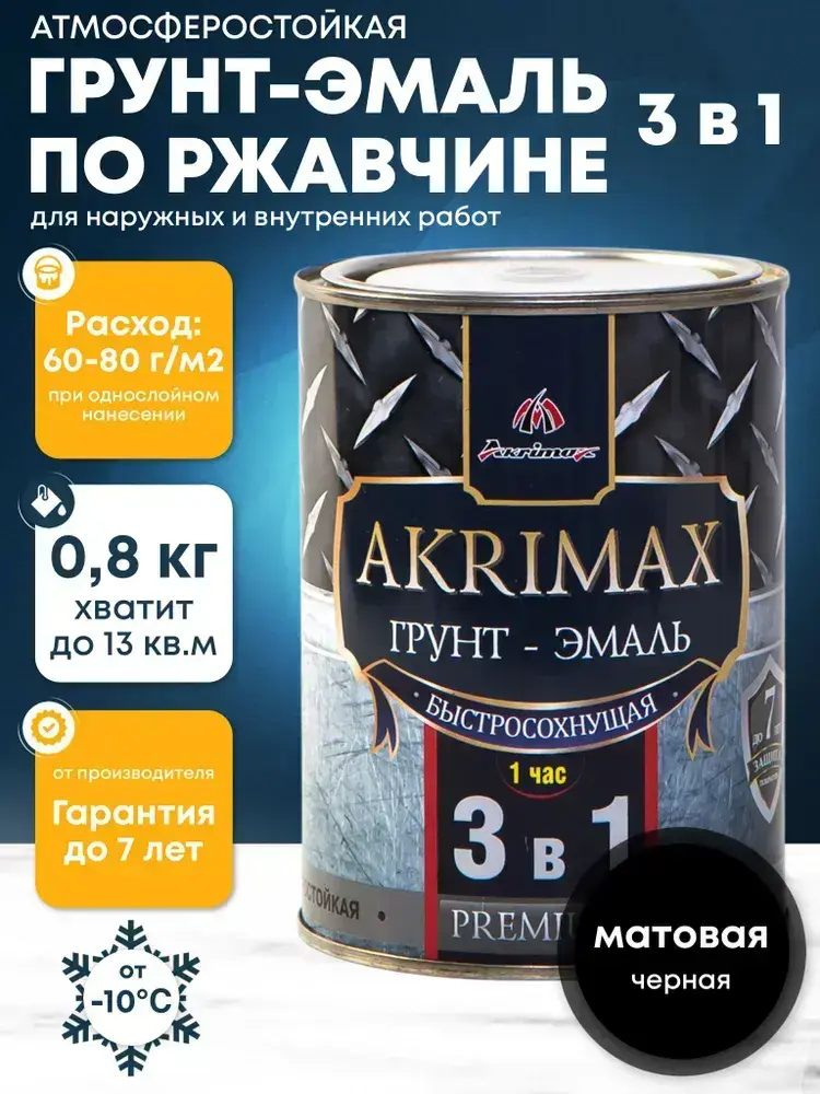 Грунт-эмаль по ржавчине 3 в 1, Краска по металлу, быстросохнущая 0,8 кг AKRIMAX-PREMIUM, матовое покрытие, черная