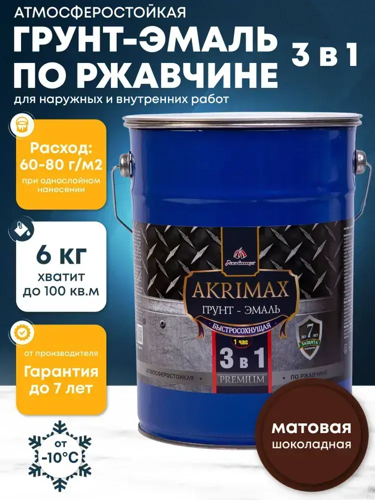 Грунт-эмаль по ржавчине 3 в 1, Краска по металлу, быстросохнущая 6 кг AKRIMAX-PREMIUM, матовое покрытие, шоколадный