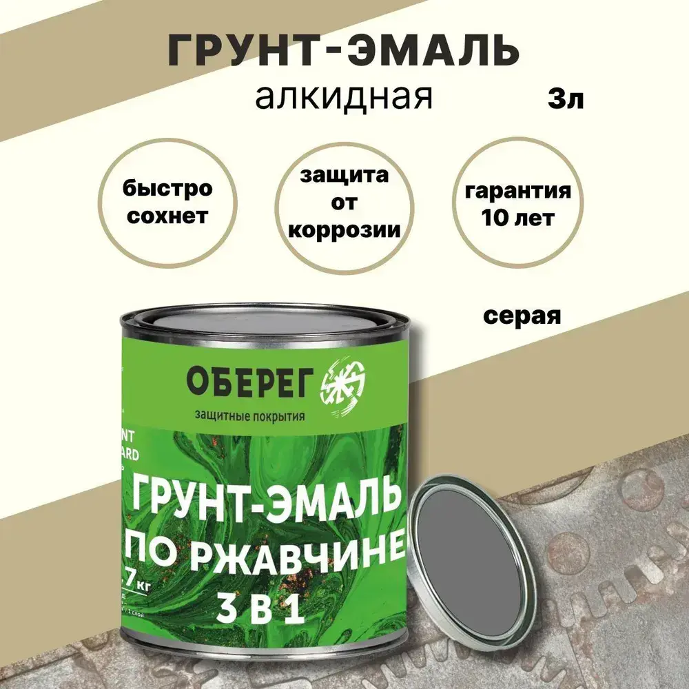 Грунт-эмаль ПО РЖАВЧИНЕ 3в1, алкидная краска для металла PaintGuard Серая - 3л/2,7кг