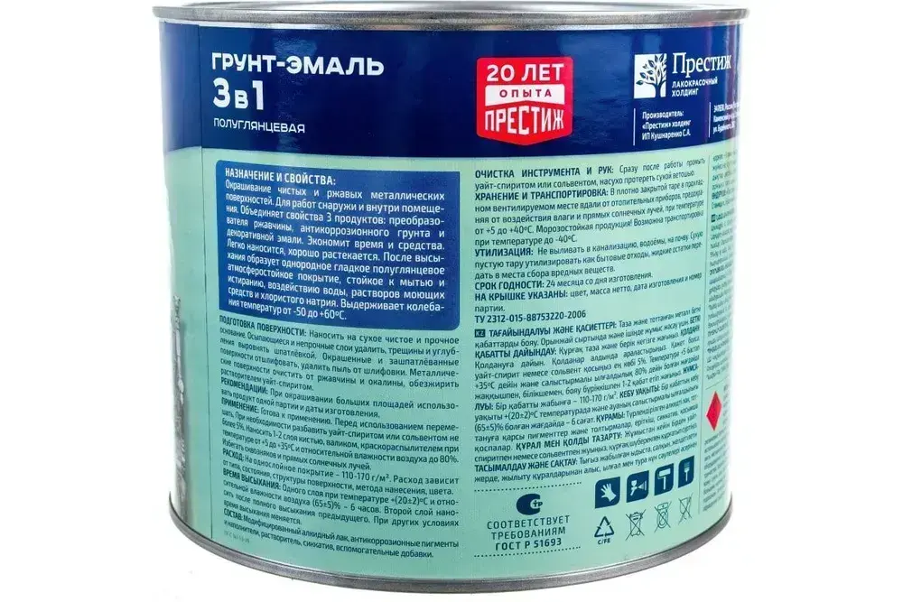 Грунт Эмаль полуглянцевая по ржавчине 3в1 Черная 1.9 кг Престиж