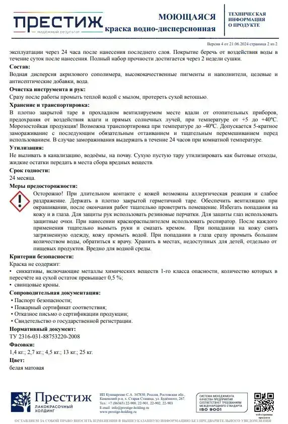 Интерьерная моющаяся краска ПРЕСТИЖ 2.7 кг. Водоэмульсионная, быстросохнущая краска с повышенным классом истирания.