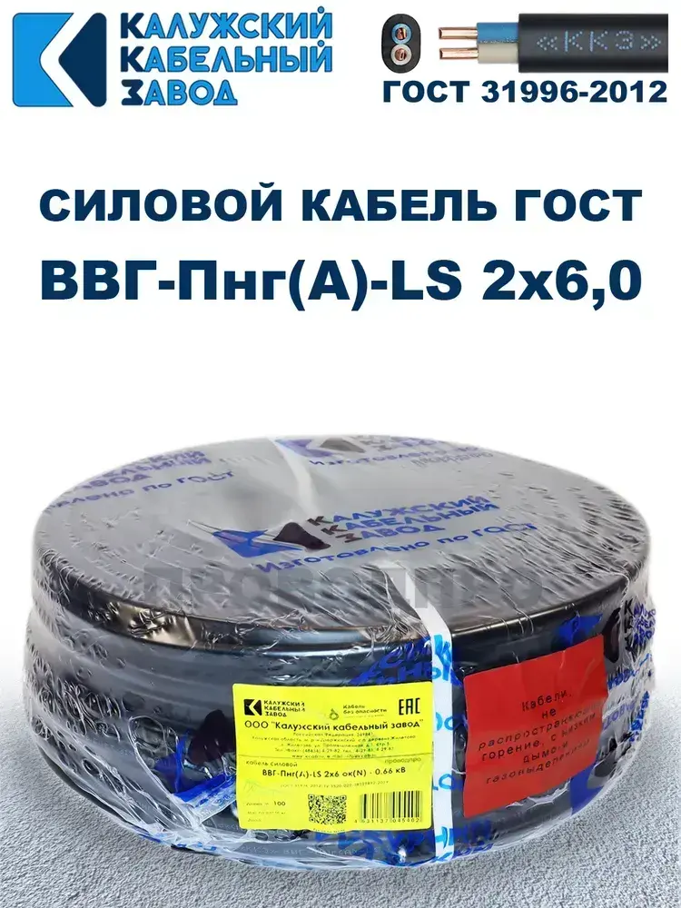 Кабель ВВГ-Пнг(А)-LS 2х6,0 ГОСТ, 10 метров, Калужский кабельный завод