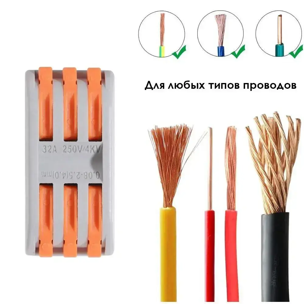Клемма соединительная проходная для проводов типа WAGO, быстрозажимная, 10 шт, 3 полюса, 6 контактов, оранжевый