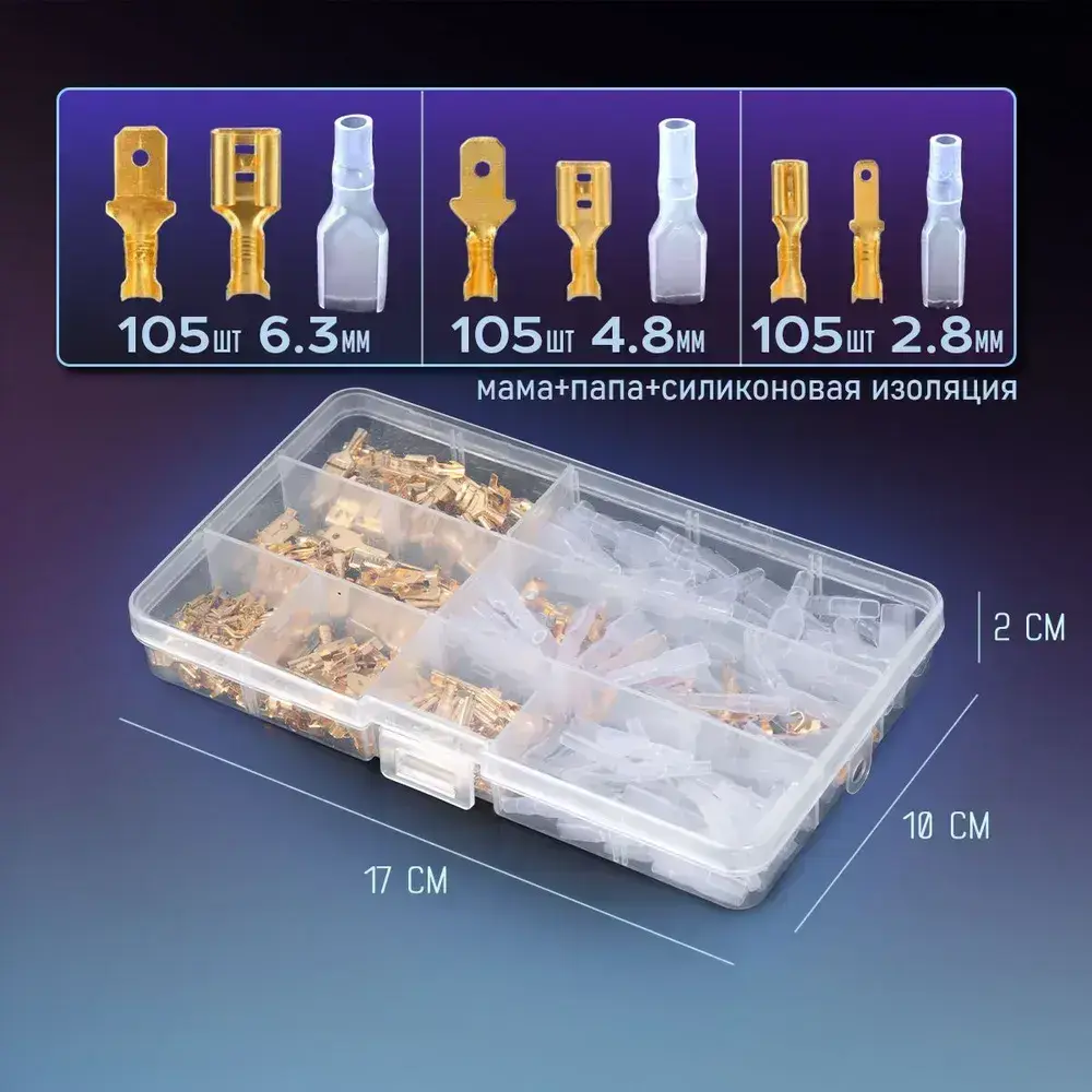 Клеммы для проводов обжимные / Соединительные автомобильные, набор 315 штук. Кабельный наконечник, мама + папа + силиконовая изоляция. Цвет золотой/прозрачный