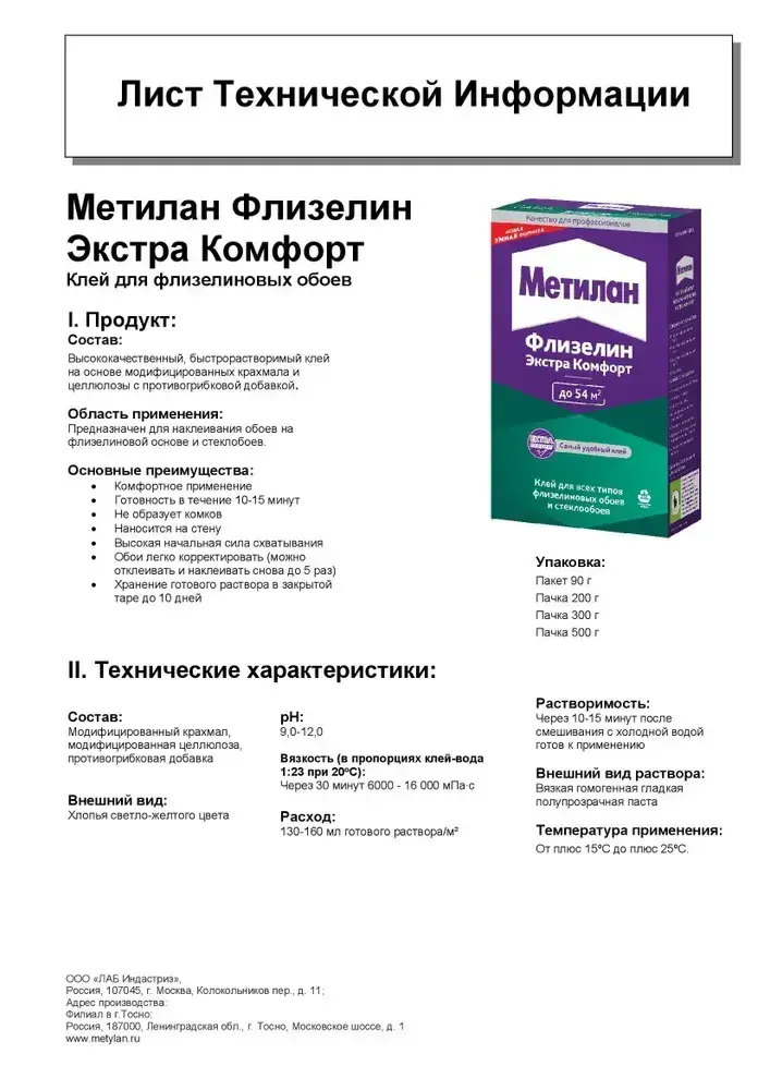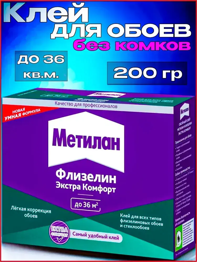 Клей для обоев Метилан Флизелин Экстра Комфорт 200 г 36 м2, для всех типов флизелиновых обоев и стеклообоев, виниловых, бумажных, универсальный