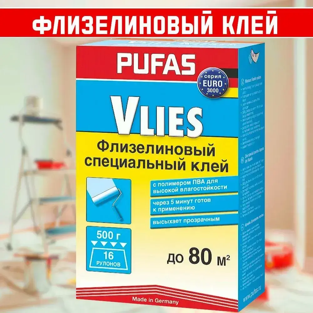 Клей для обоев специальный флизелиновый, Pufas Euro 3000 Vlies Kleber, 500 г., для обоев на флизелиновой и бумажной основе. Производство Германия Пуфас
