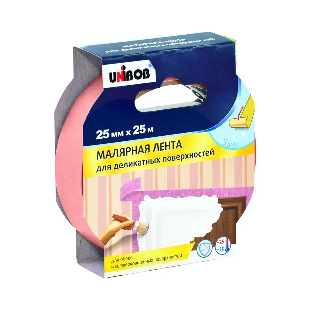 Клейкая лента малярная для деликатных поверхностей 25мм х 25м UNIBOB (розовая) Малярный скотч