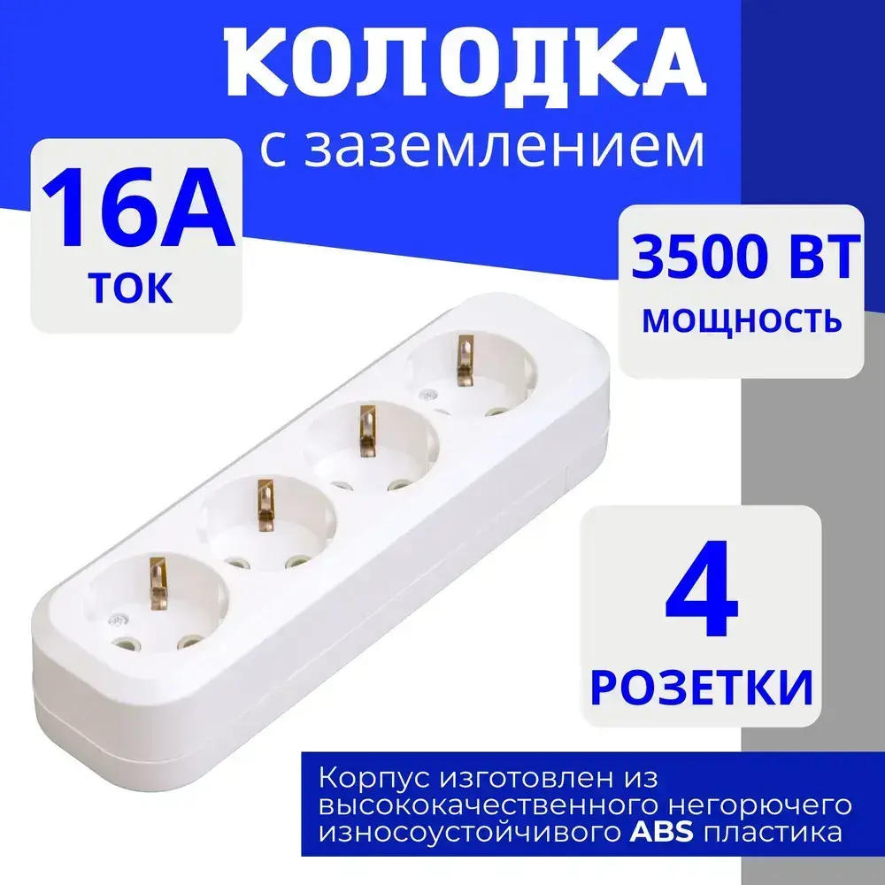 Колодка для удлинителя на 4 розетки, с заземлением 220В 16А
