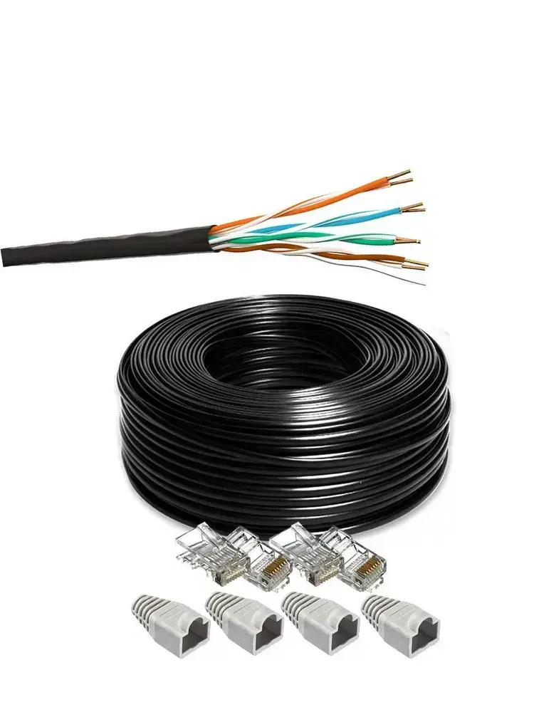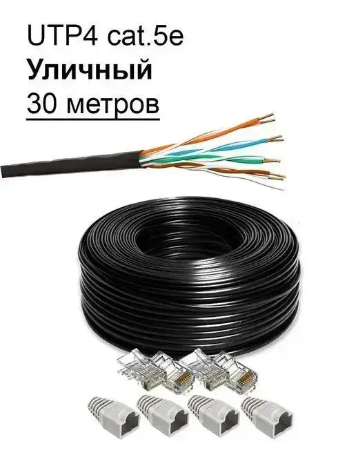 Комплект: Интернет кабель уличный витая пара UTP4 cat.5e, одножильный с коннектором rj45 и колпачками rj45 внешний для наружной прокладки 30 метров