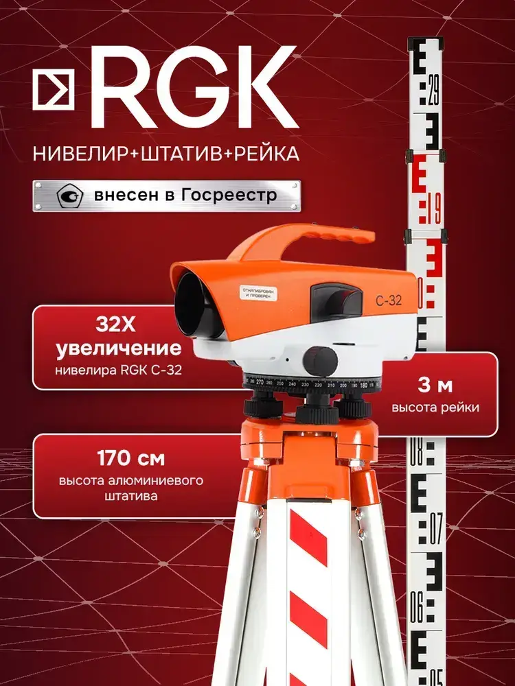 Комплект: оптический нивелир RGK C-32 + штатив S6-N + рейка AMO S3