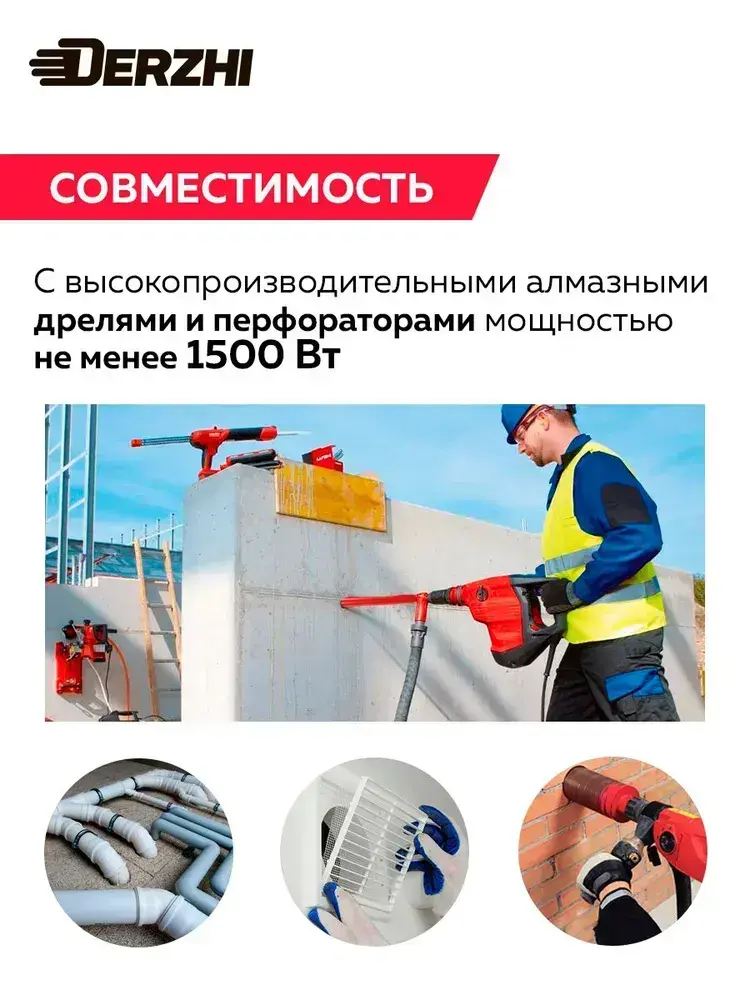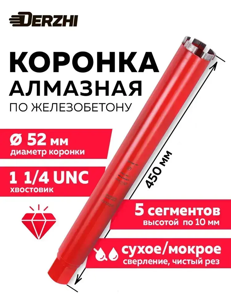 Коронка для алмазного сверления 52*450/470мм, 5 сегментов, резьба 1 1/4"UNC DERZHI
