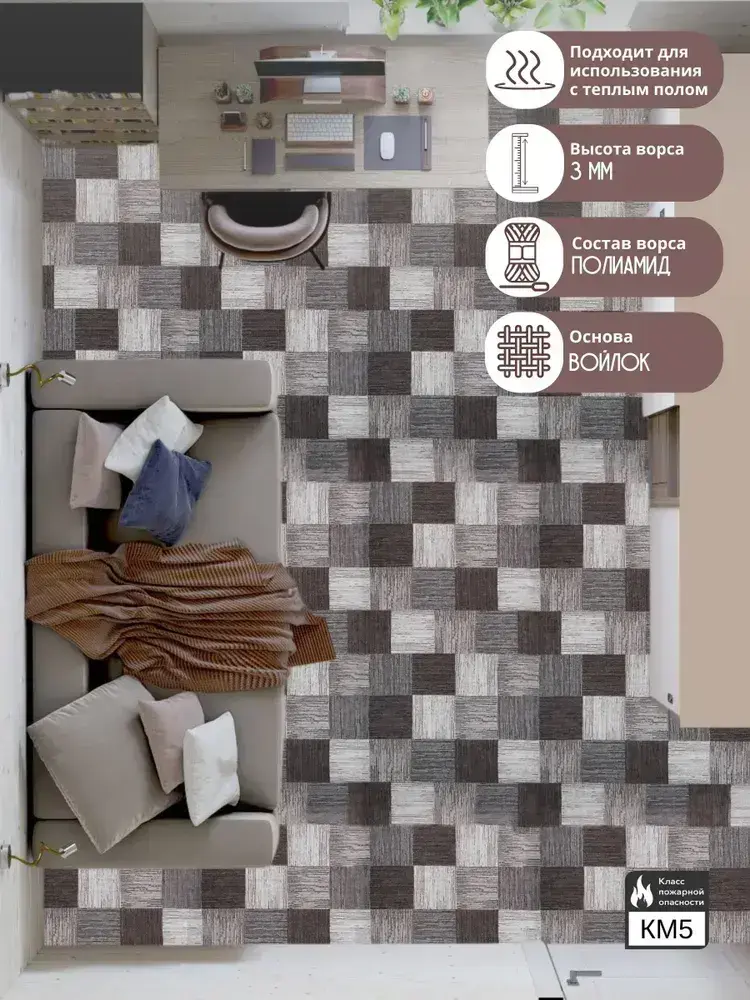 Ковролин метражом 2х3,5 м, безворсовой "Плитка", коричнево-серая без оверлока