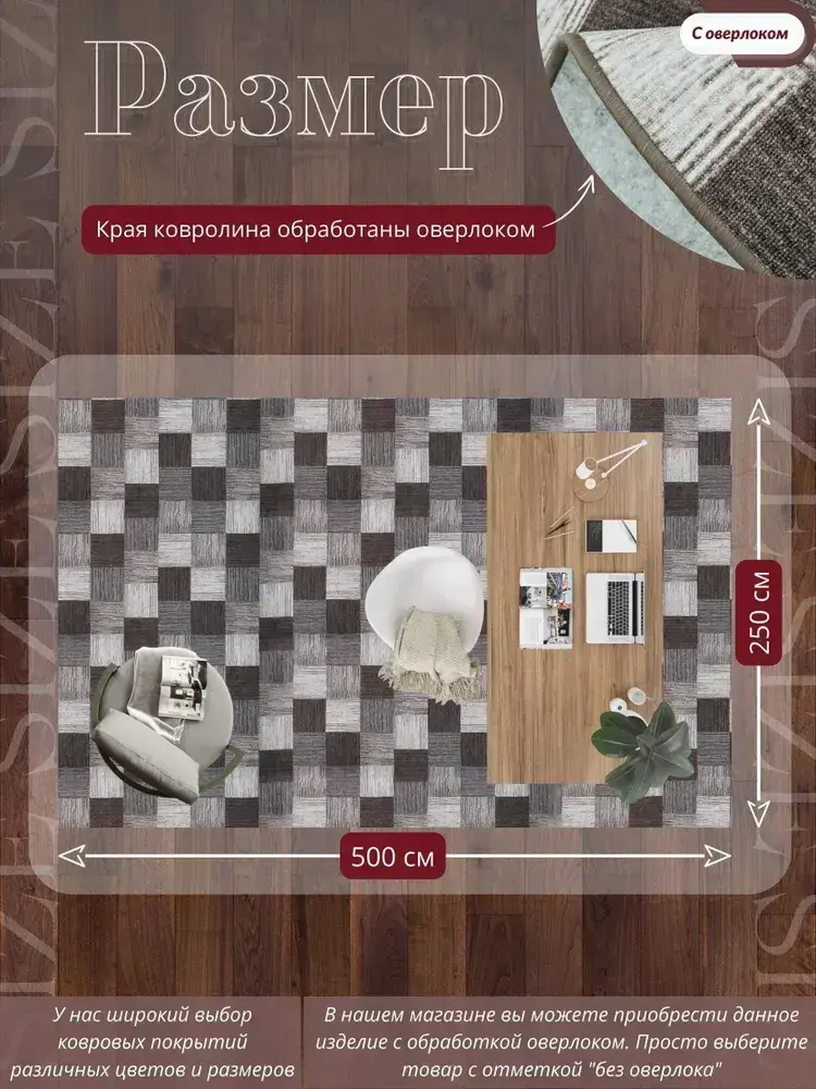 Ковролин метражом 5х2,5 м, безворсовой "Плитка", коричнево-серая с оверлоком