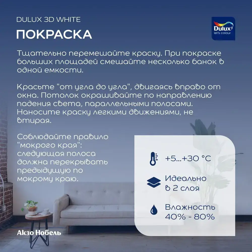 Краска для стен и потолков водно-дисперсионная Dulux 3D White матовая база BW 2,5 л