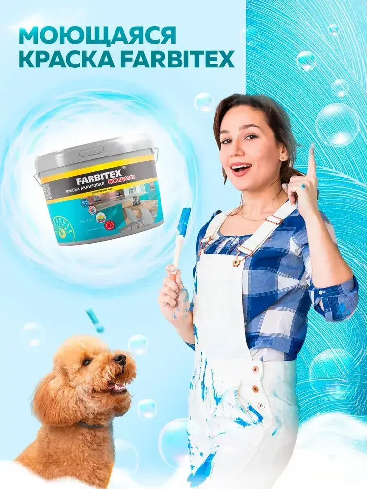 Краска моющаяся для стен и потолков 1,1 кг супербелая матовая FARBITEX без запаха, акриловая, быстросохнущая