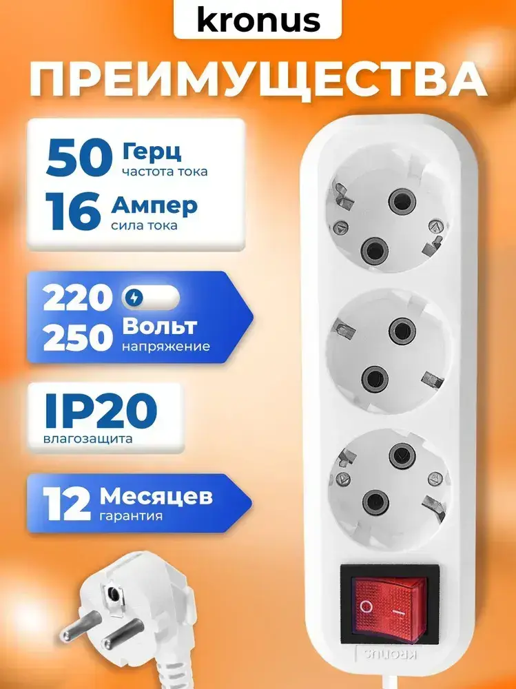 Kronus Удлинитель сетевой 5м 3 розетки с выключателем и заземлением