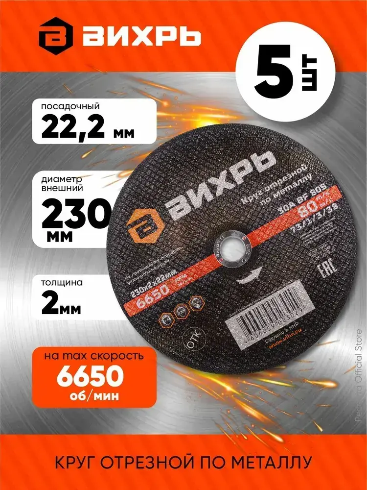 Круг отрезной по металлу Вихрь 230х2,0 (комплект 5 штук)