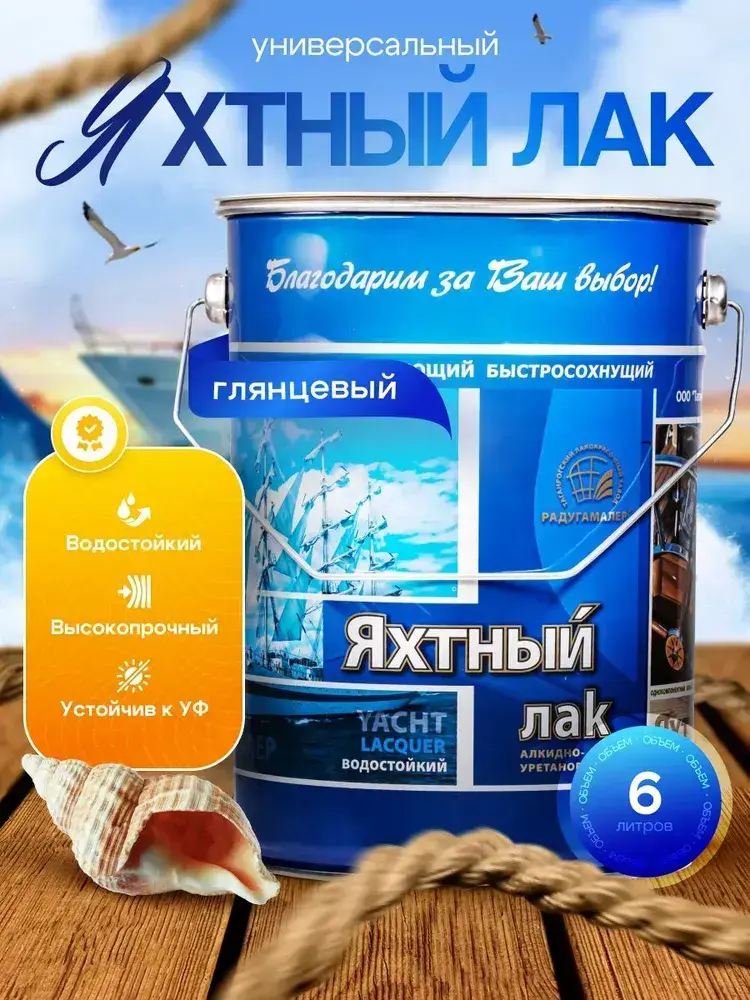 Лак яхтный для дерева глянцевый бесцветный 6л, РАДУГАМАЛЕР / быстросохнущий, высокопрочный, атмосферостойкий, водостойкий, устойчив к УФ - излучению