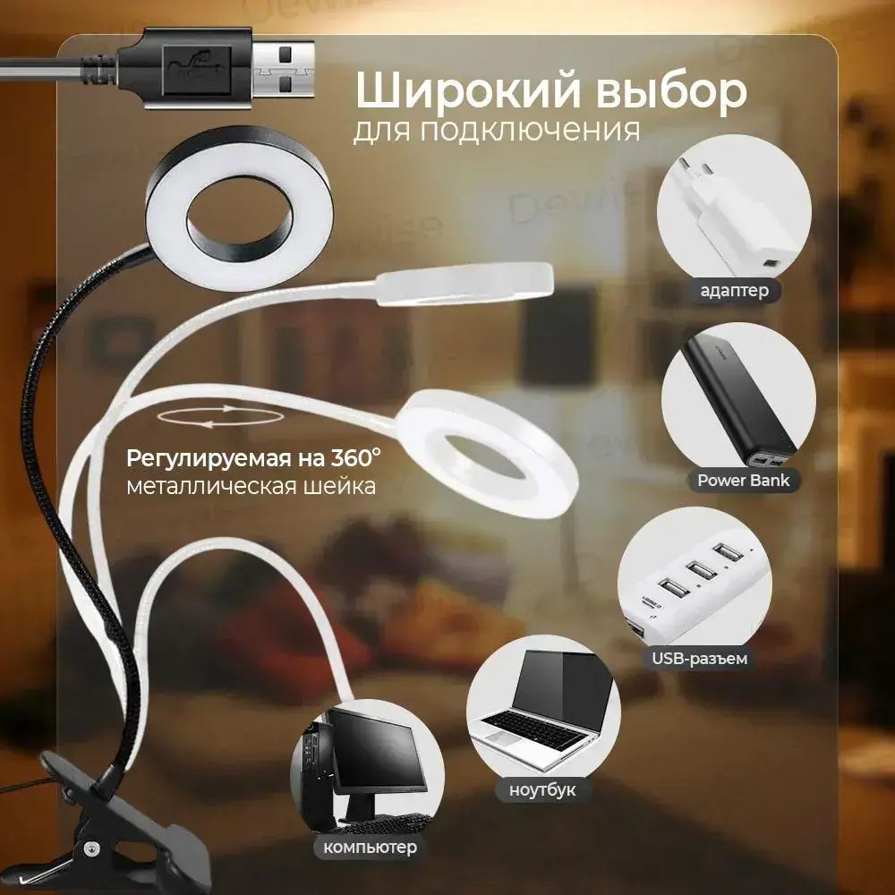 Лампа настольная для школьника светодиодная. Кольцевая лампа для маникюра на прищепке. USB светильник с 3 цветовыми режимами.
