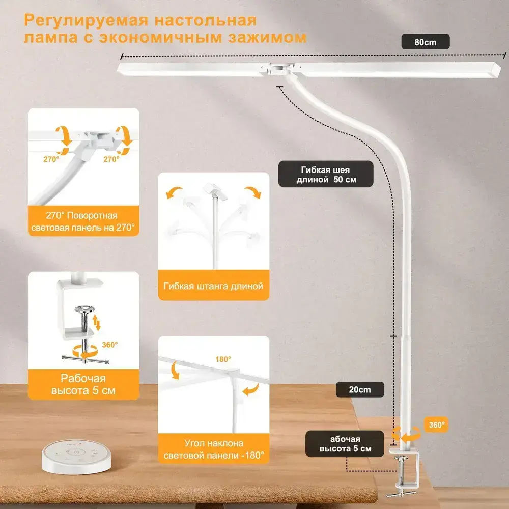 Лампа настольная для школьника,3000K-5500K, 80*70cm лампа настольная на струбцине,белое