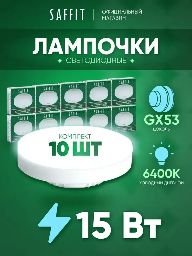 Лампа светодиодная GX53 15W 6400K таблетка, дневной белый свет, Saffit SBGX5315 55193, Упаковка 10 штук