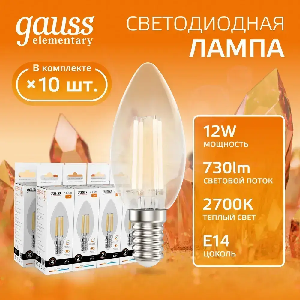 Лампочка светодиодная E14 Свеча 12W теплый свет 2700К УПАКОВКА 10 шт. Gauss Elementary Filament