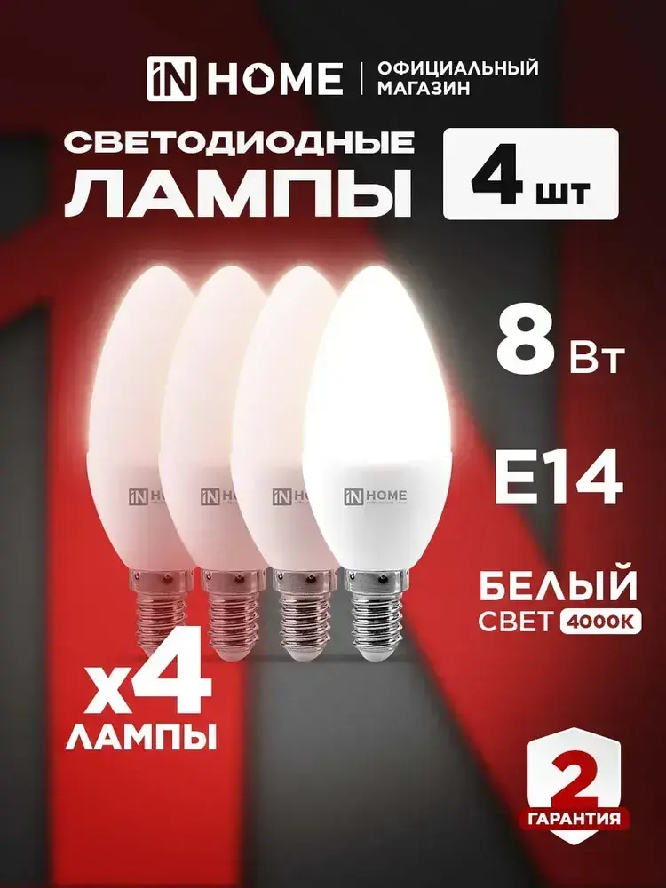 Лампочка светодиодная Е14 свеча 8Вт нейтральный белый 4000К 760Лм упаковка 4шт. IN HOME