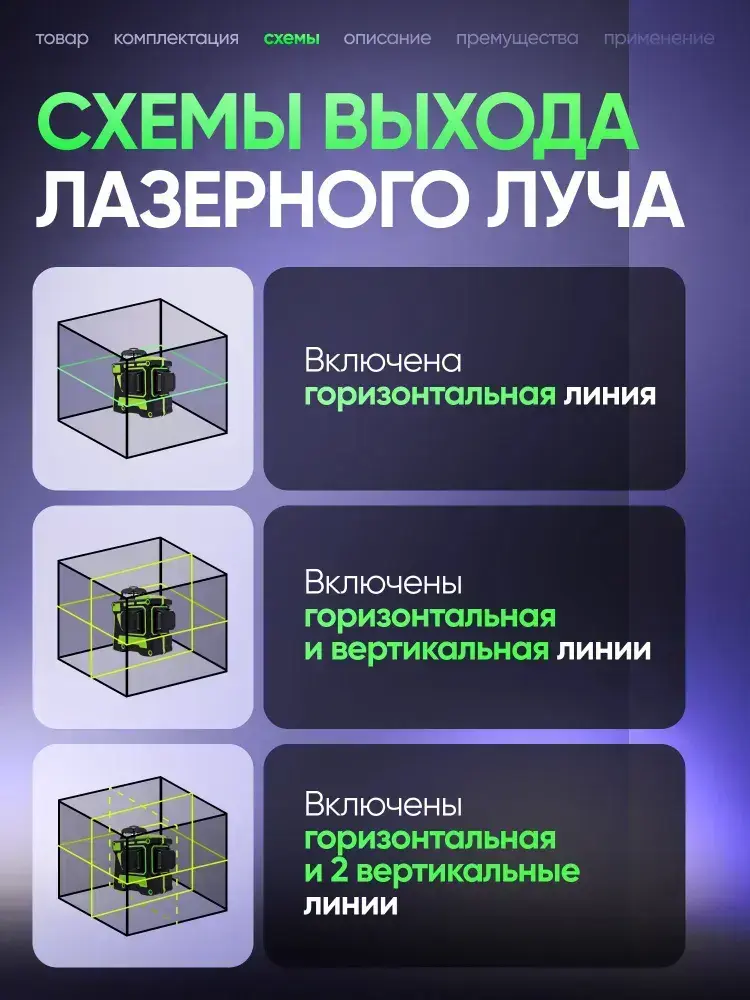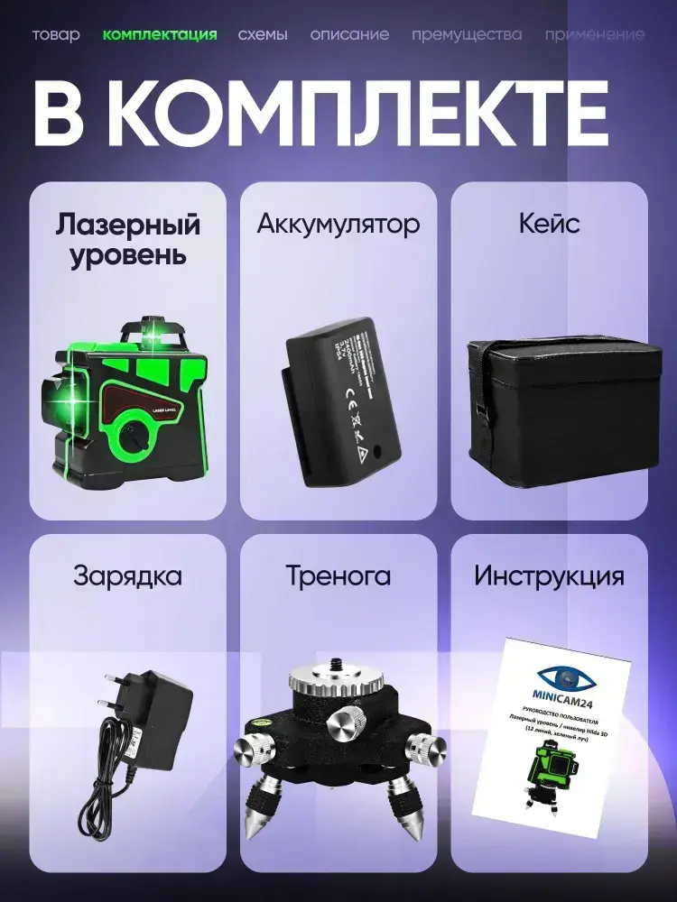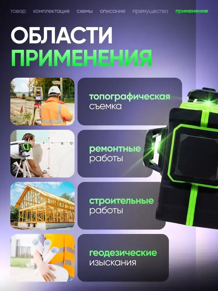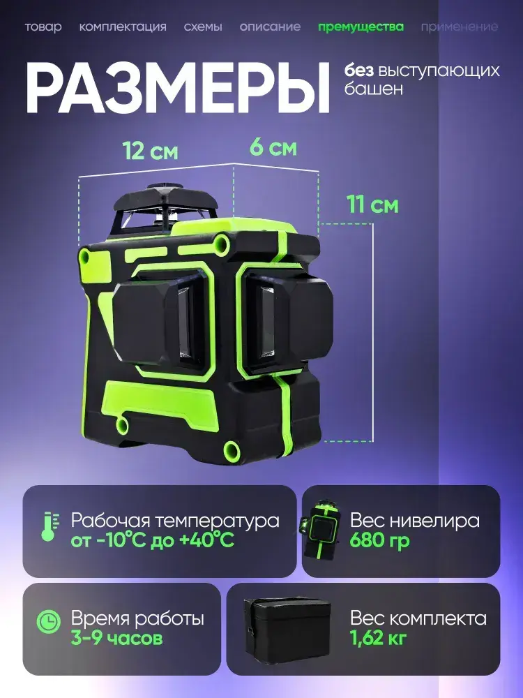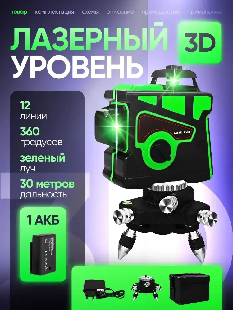 Лазерный уровень / нивелир 3D (12 линий, зеленый луч), кейс-сумка в комплекте