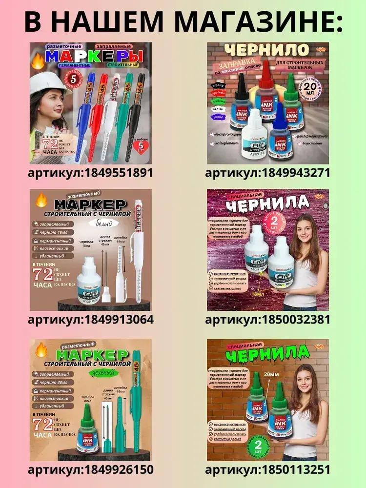 Маркер строительный с длинным наконечником 45мм, заправляемый и чернила 20мл, черный