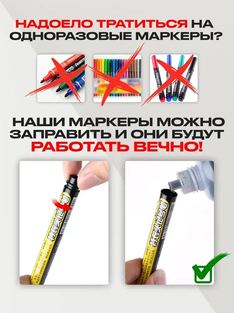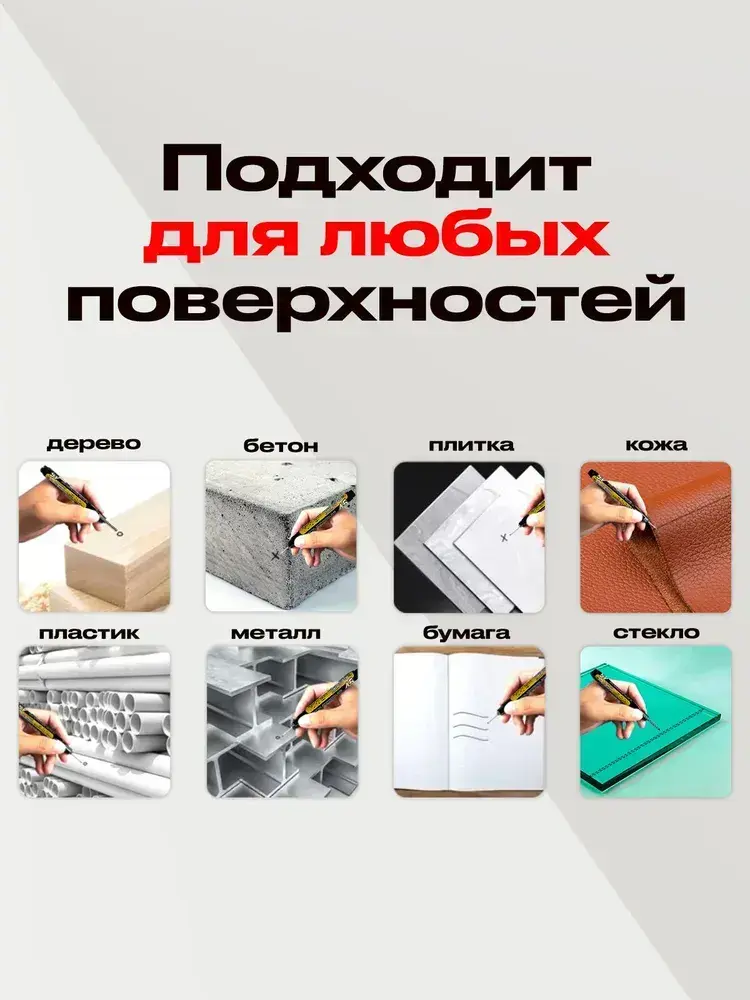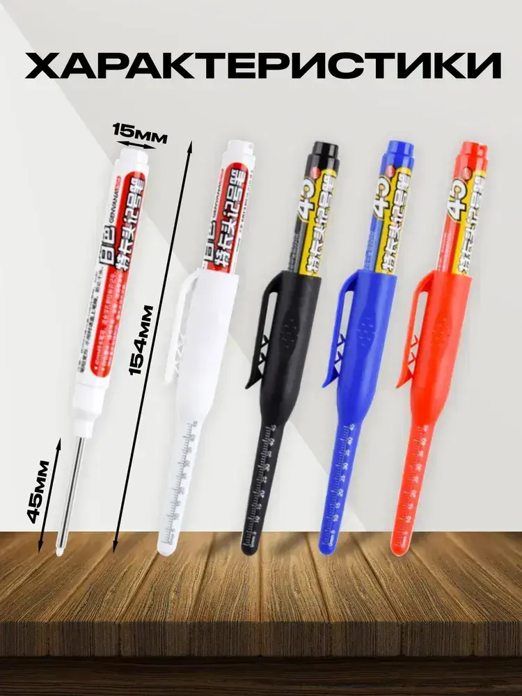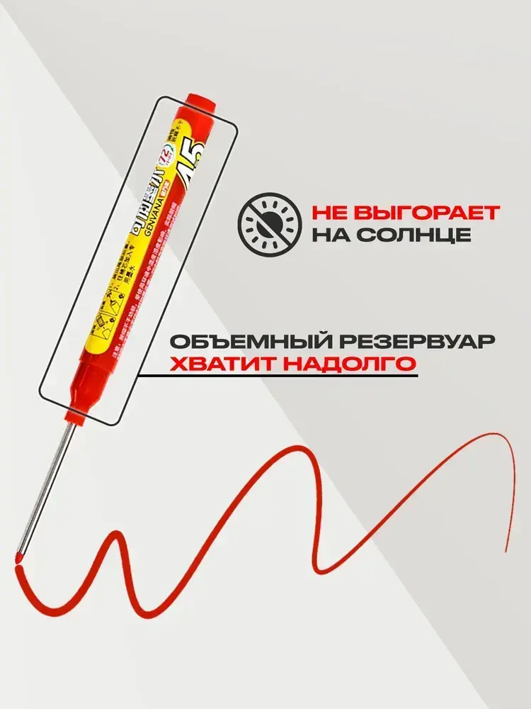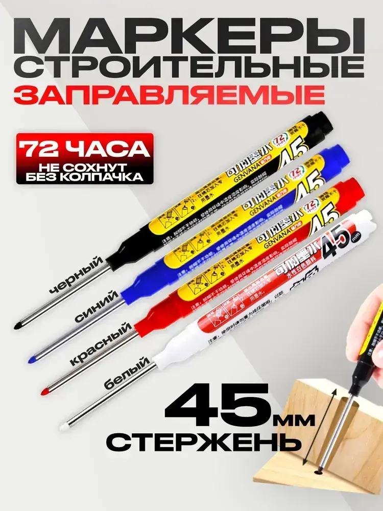 Маркер строительный тонкий разметочный с длинным наконечником 45мм заправляемый / 4 шт (черный, красный, синий, белый) / Маркеры строительные набор для разметки по металлу, дереву, стеклу, ткани