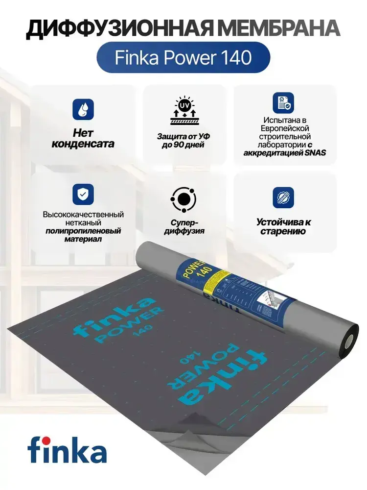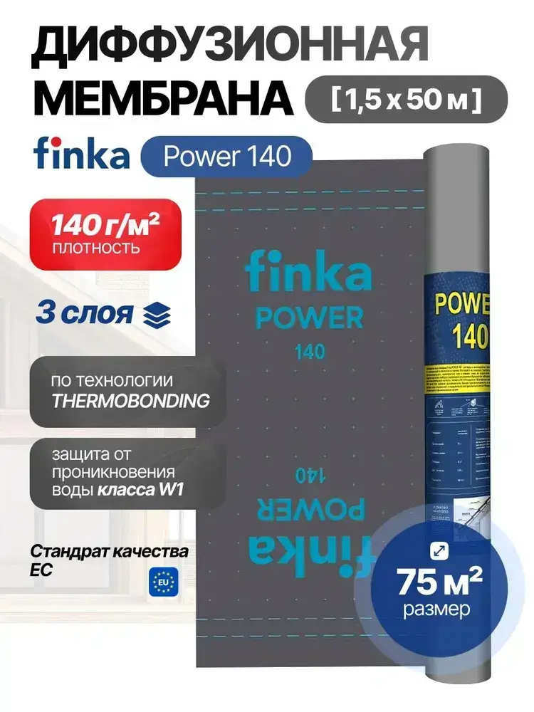 Мембрана Finka Power, 140 г/кв.м 1,5*50м 75м2, диффузионная, ветро влагозащитная, для кровли и стен, черная