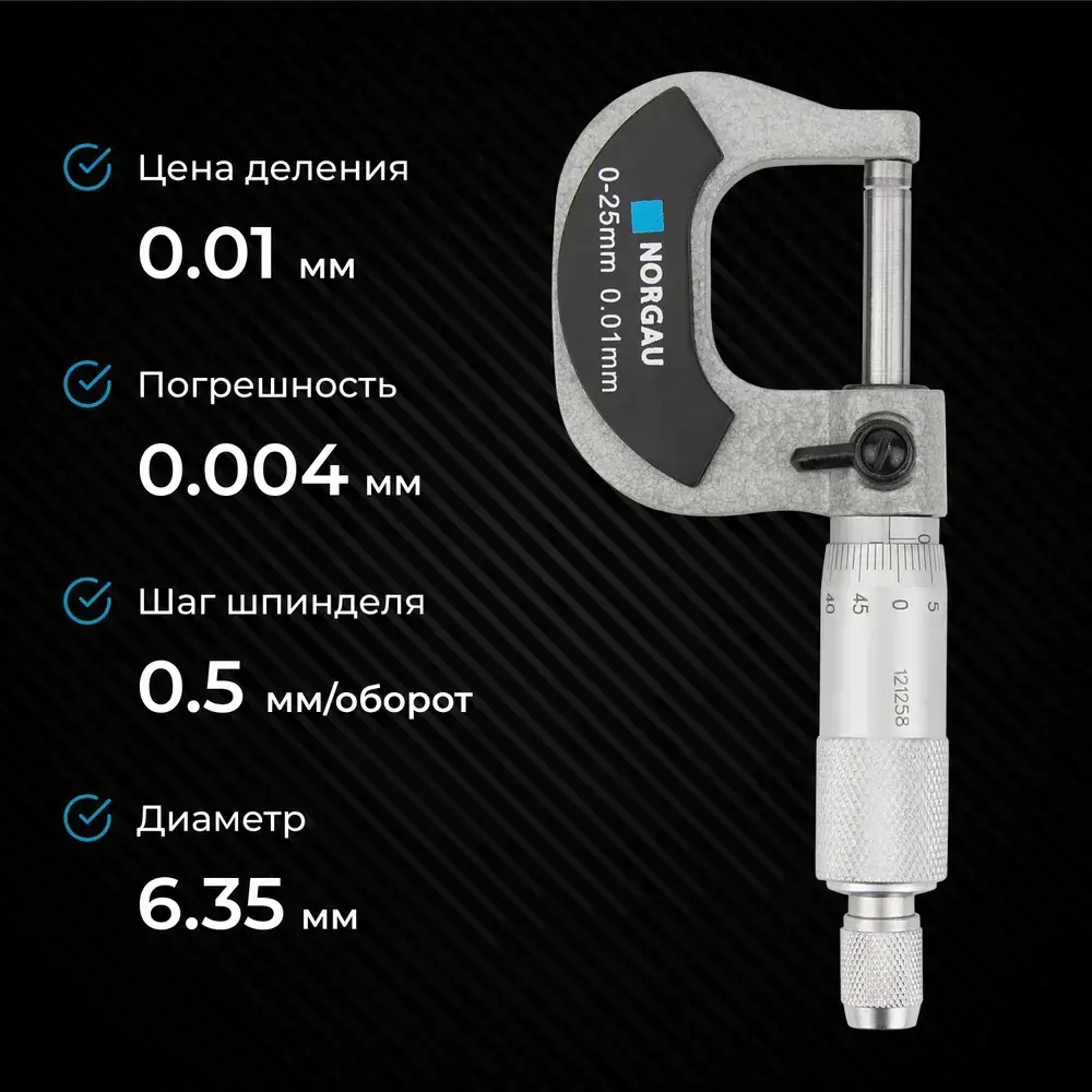 Микрометр гладкий NORGAU Industrial 0-25 мм, ГОСТ, Госреестр, с тонко притёртыми измерительными поверхностями