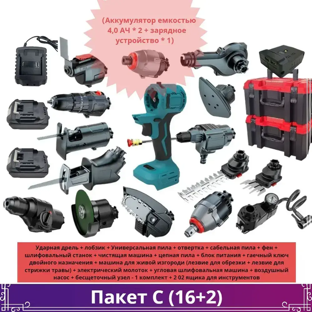 Многофункциональный набор бесщеточных электроинструментов с бесщеточным двигателем 16 + 2, 2 батарейками емкостью 4,0 АЧ и 2 ящиками для инструментов, полным набором аксессуаров