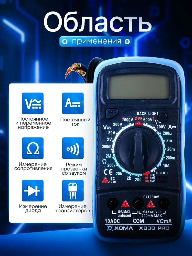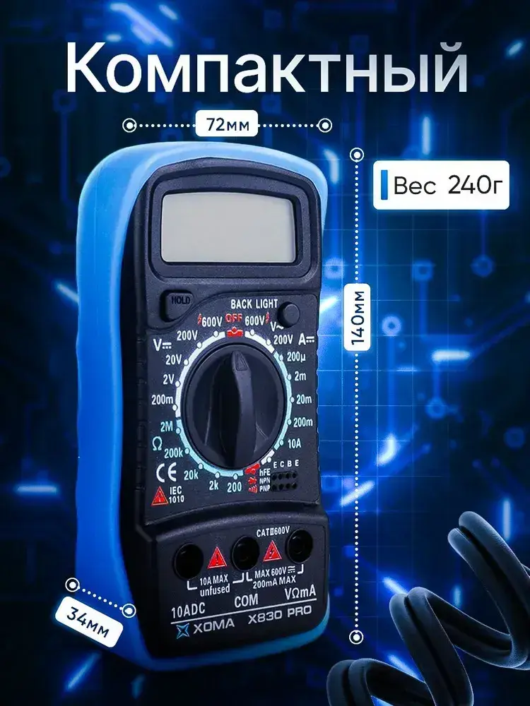 Мультиметр и тестер цифровой с прозвонкой и щупами, чехол для хранения, подсветка экрана